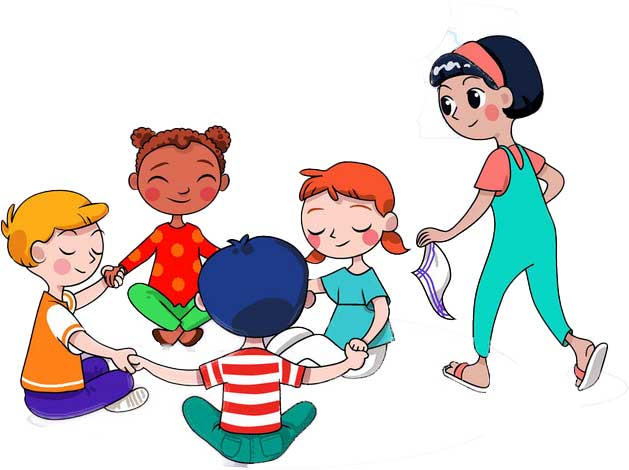 De kinderen zitten in een kring, met het gezicht naar binnen en de ogen (liefst) dicht of naar de grond.